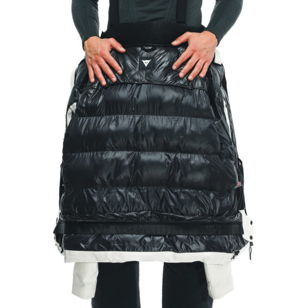 The Ski Downjackets are an iconic part of the Dainese collection, designed to maximize thermal insulation and ensure superior comfort in all weather conditions. The SKI DOWNJACKET SPORT is constructed with a Dermizax® EV 20,000-mm, 20,000-g/m², 24h waterproof membrane, elastic in four directions. Thermal insulation is ensured with Primaloft® Silver Cross Core padding that, owing to the use of Aerogel – the world’s lightest solid, made up of 95% air – protects against even the coldest temperatures, while keeping weight and bulk to a minimum. The D-Dry® A+ stretch membrane under the arms allows maximum freedom of movement and breathability during every phase of activity, leaving the most mobile area of the torso free of padding. Large, adjustable zippered air vents on the chest allow plenty of ventilation on hot days, and can be used as storage pockets owing to their double garage structure. A compact fixed hood, internal waist gaiters and snow cuffs inside the sleeves round out the details of a garment designed to suit all conditions.