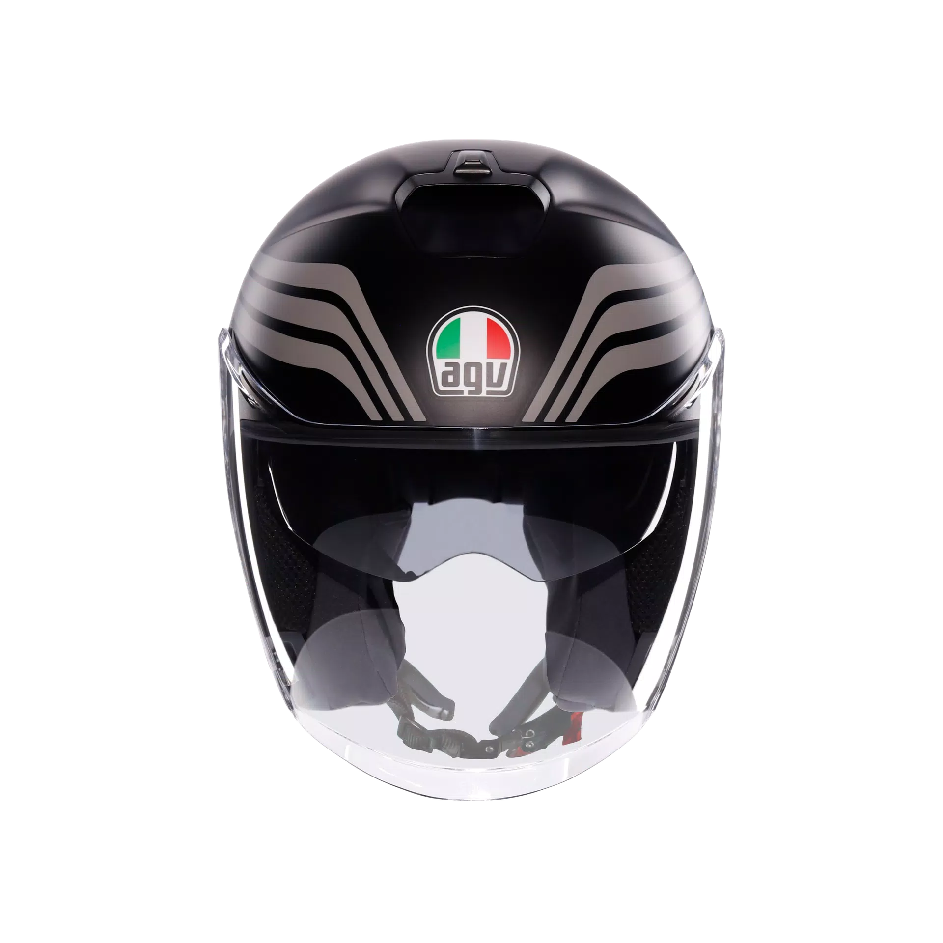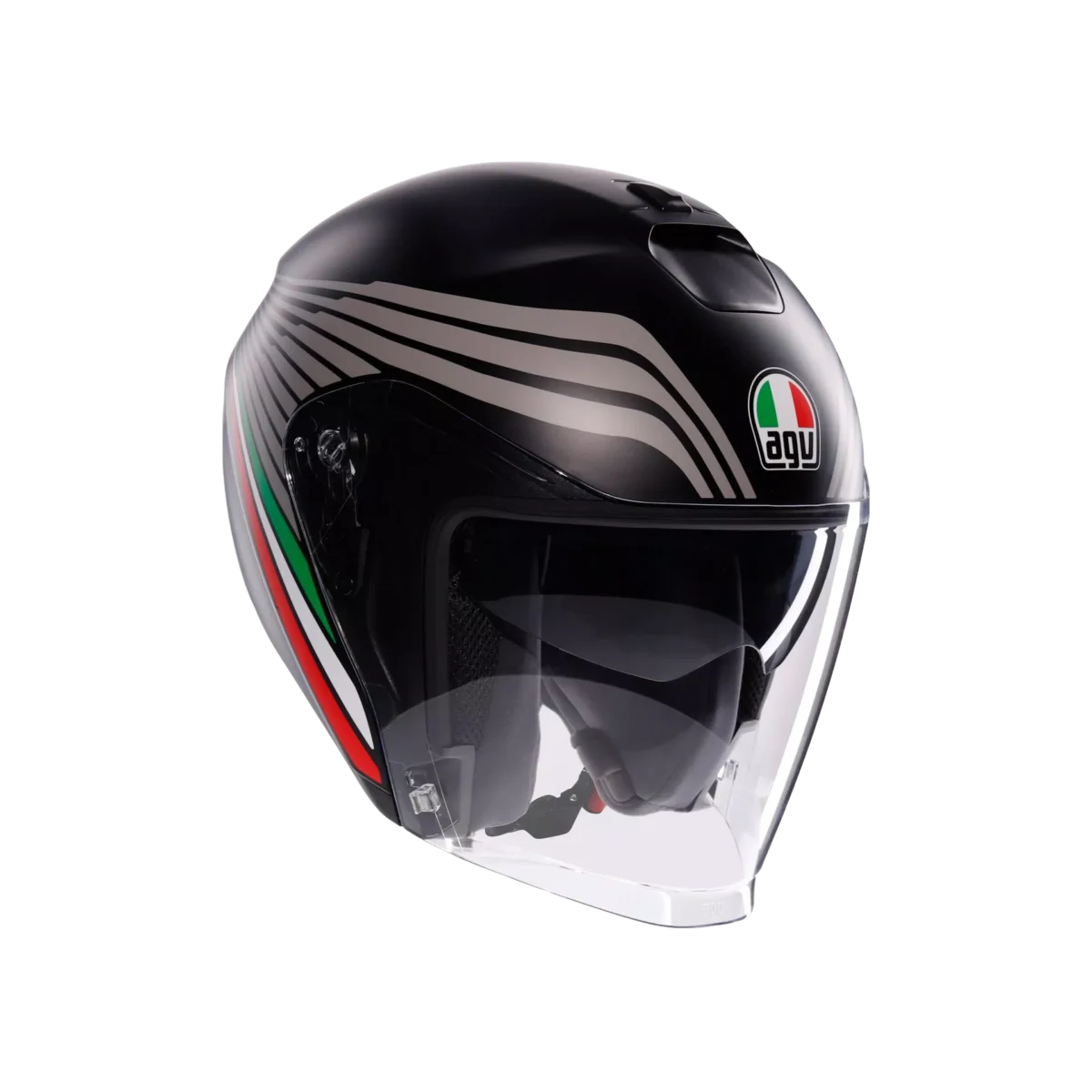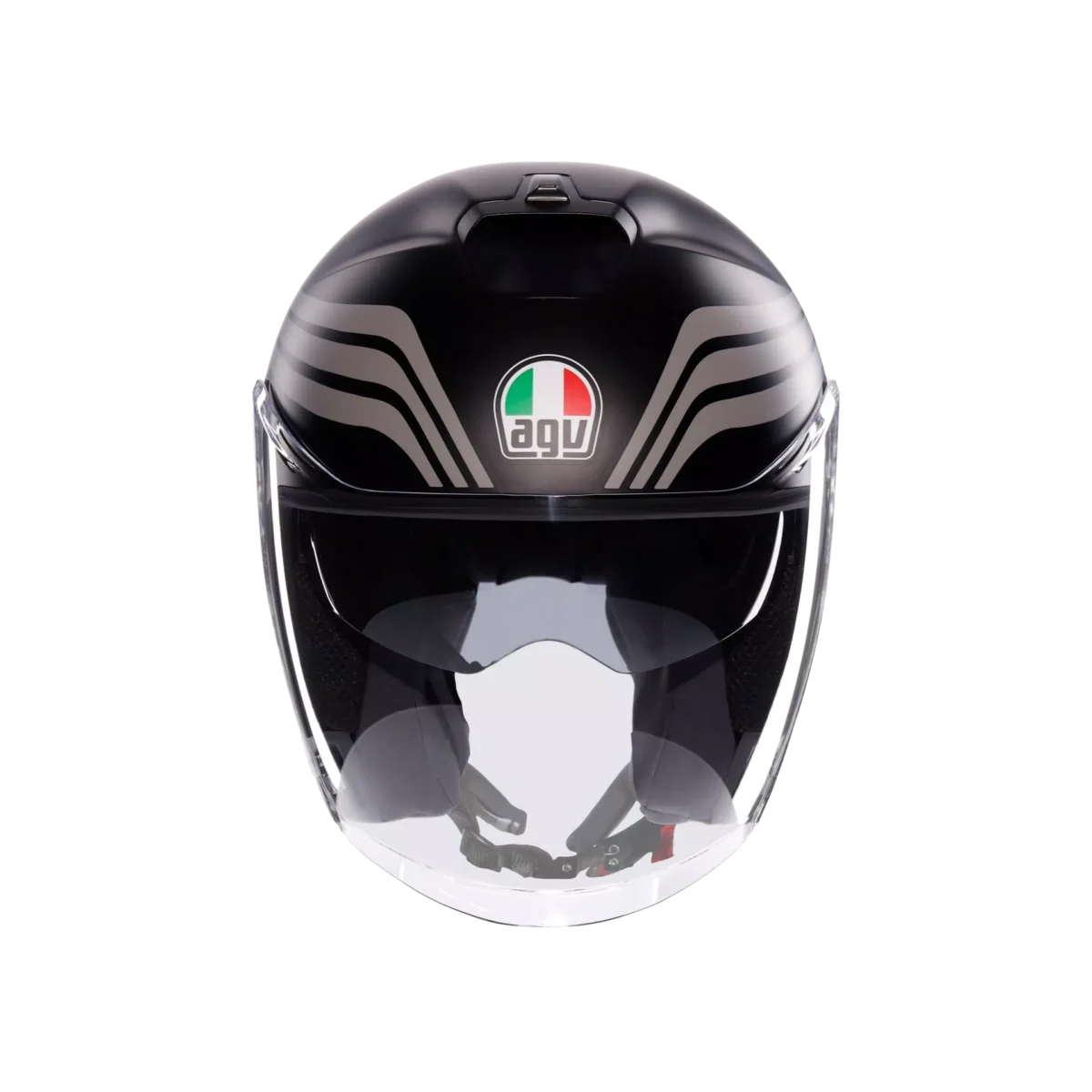 Irides is the new AGV open-face helmet in thermoplastic material, with ECE2206 homologation, designed to guarantee protection and comfort in everyday urban travel. Featuring a clean and modern design and extremely accurate side plate details, this helmet is distinguished by an elongated visor – synonymous with protection – with VMS (Visor Magnetic System) magnetic closuremechanism, for maximum stability and comfort even at high speeds. The visor, designed to house the Pinlock® 70 anti-fog lens (available as an accessory) and the adjustable sun visor ensure optimal visibility in any condition, both on sunny and cloudier days, when the sudden change in temperature between the surrounding environment and the inside of the helmet could cause annoying fogging. Thermal comfort inside the helmet is guaranteed by the adjustable upper air vent andrear extractor, which facilitate the exchange between the hot air inside the helmet and fresh air coming from the outside. Irides’s internal configuration ensures an optimal fit owing to its customization qualities: Cheek pads featuring different thicknesses are available, perfectly interchangeable between all helmet sizes, for a total of 24 possible configurations. All interiors, as well as the chin strap, are completely detachable and washable. Perfect for everyday urban outings, Irides is a highly functional helmet: During daily commute, features such as its micrometric closure, anti-theft ring – also useful for storing the helmet in maximum safety – and compatibility with the most modern communication systems are truly essential.