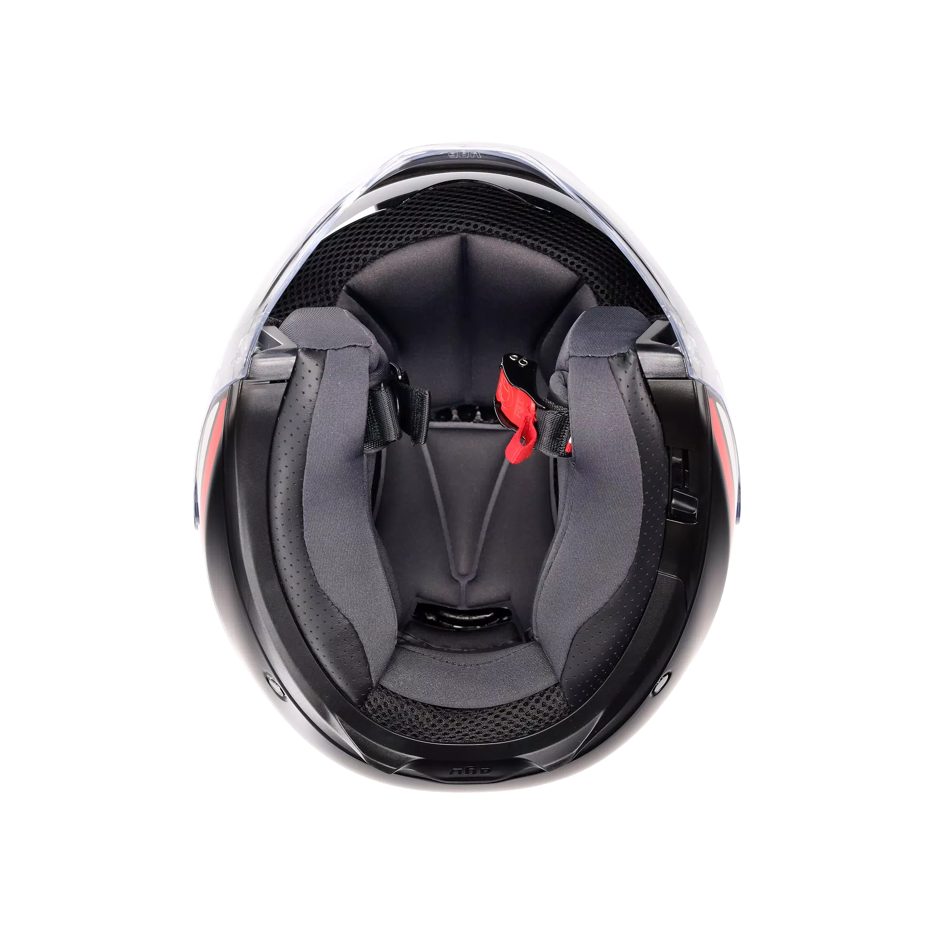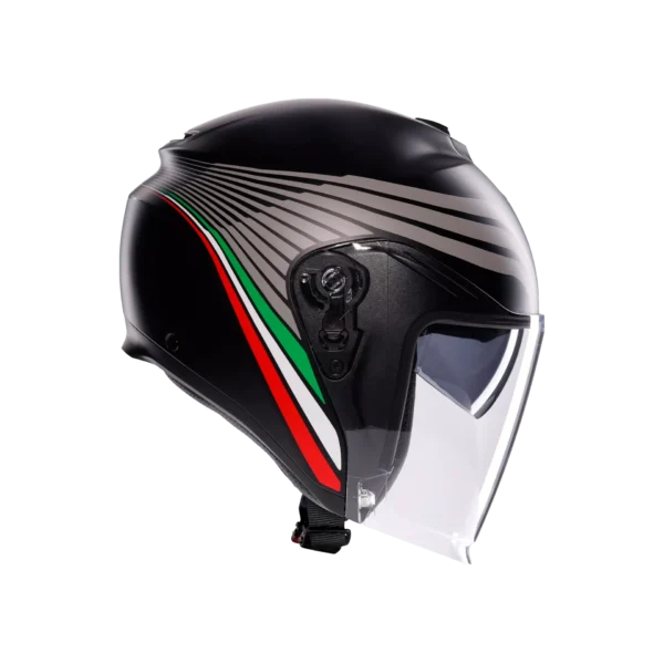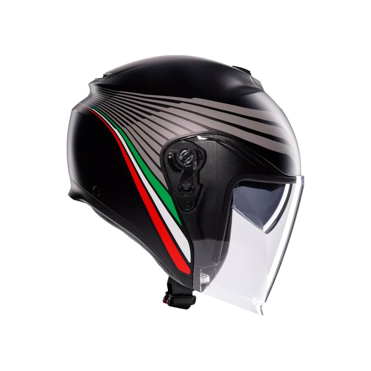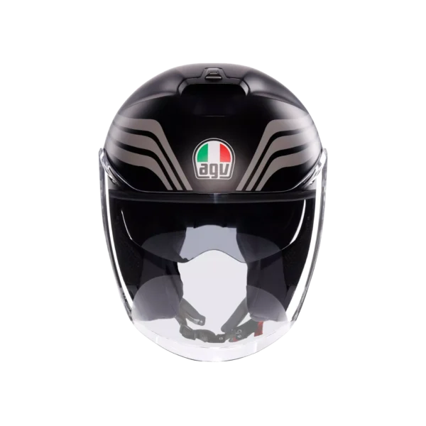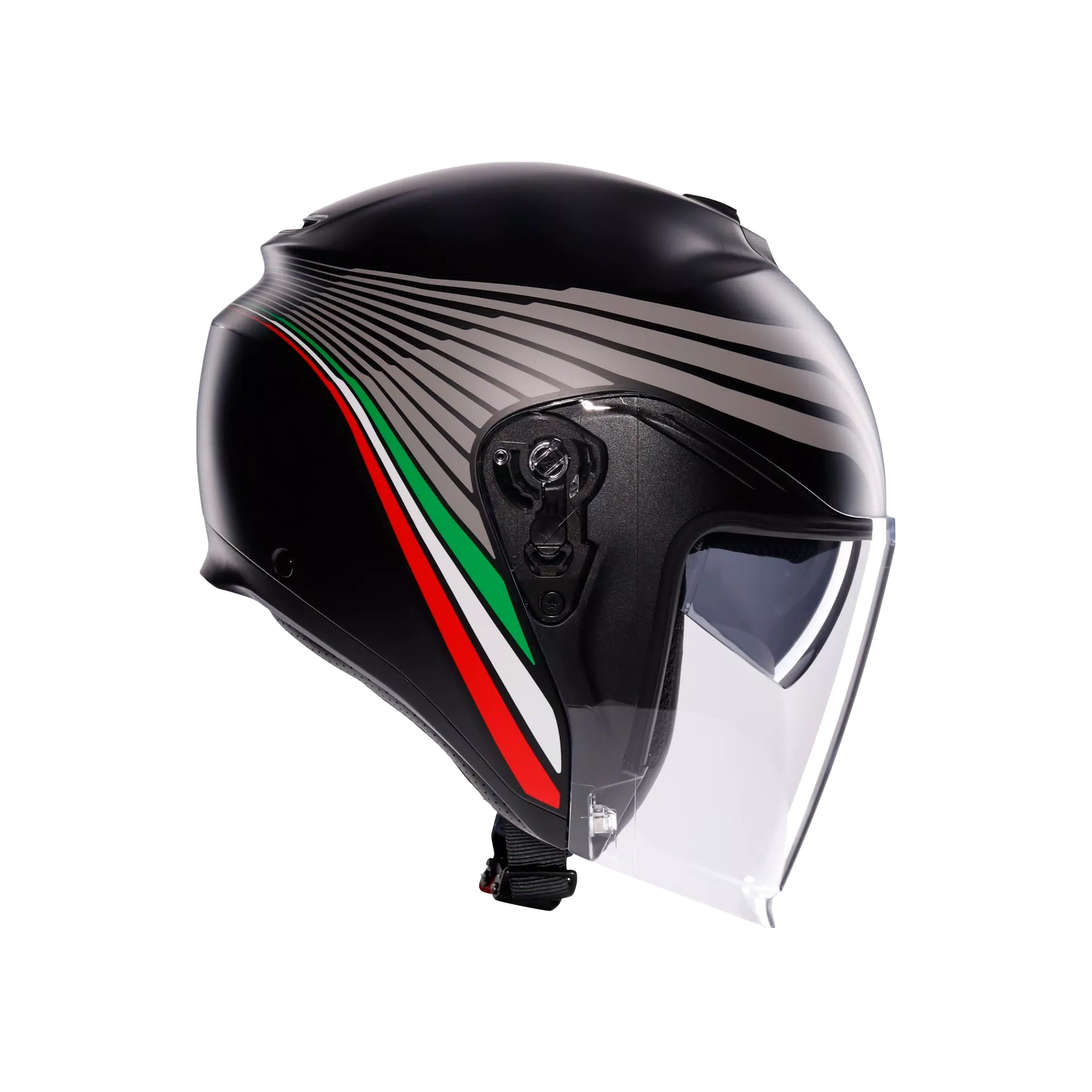 Irides is the new AGV open-face helmet in thermoplastic material, with ECE2206 homologation, designed to guarantee protection and comfort in everyday urban travel. Featuring a clean and modern design and extremely accurate side plate details, this helmet is distinguished by an elongated visor – synonymous with protection – with VMS (Visor Magnetic System) magnetic closuremechanism, for maximum stability and comfort even at high speeds. The visor, designed to house the Pinlock® 70 anti-fog lens (available as an accessory) and the adjustable sun visor ensure optimal visibility in any condition, both on sunny and cloudier days, when the sudden change in temperature between the surrounding environment and the inside of the helmet could cause annoying fogging. Thermal comfort inside the helmet is guaranteed by the adjustable upper air vent andrear extractor, which facilitate the exchange between the hot air inside the helmet and fresh air coming from the outside. Irides’s internal configuration ensures an optimal fit owing to its customization qualities: Cheek pads featuring different thicknesses are available, perfectly interchangeable between all helmet sizes, for a total of 24 possible configurations. All interiors, as well as the chin strap, are completely detachable and washable. Perfect for everyday urban outings, Irides is a highly functional helmet: During daily commute, features such as its micrometric closure, anti-theft ring – also useful for storing the helmet in maximum safety – and compatibility with the most modern communication systems are truly essential.